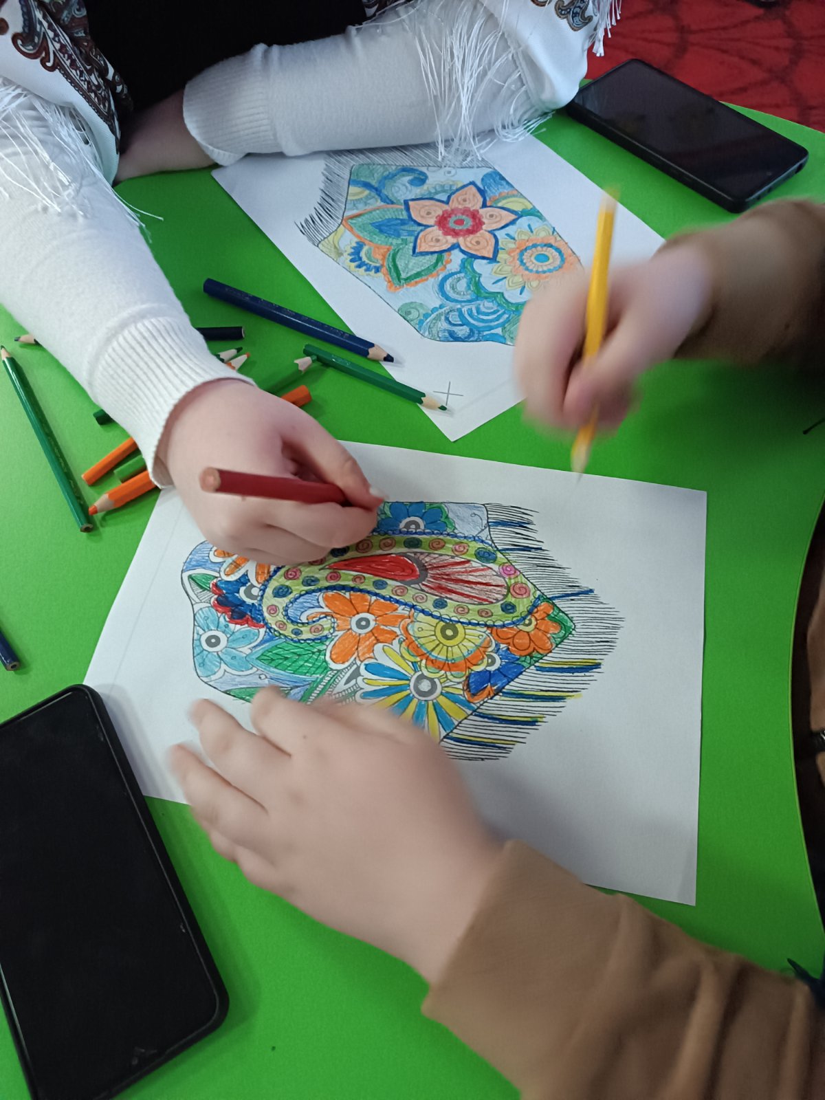 Дітям розповіли про давній національний аксесуар, який зберігає в собі старовинні традиції та є оберегом і важливим ритуальним предметом української культури. Учні власноруч розмалювали ескізи української сучасної хустки із використанням автентичних мотивів.